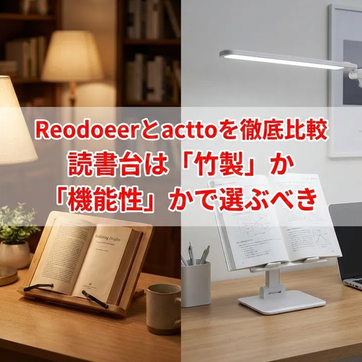 人気ブックスタンド2種(Reodoeer竹製・actto BST-02)をカタログスペックと構造から比較。インテリア重視ならReodoeer、機能重視ならactto。それぞれのメリット・デメリットを分析。